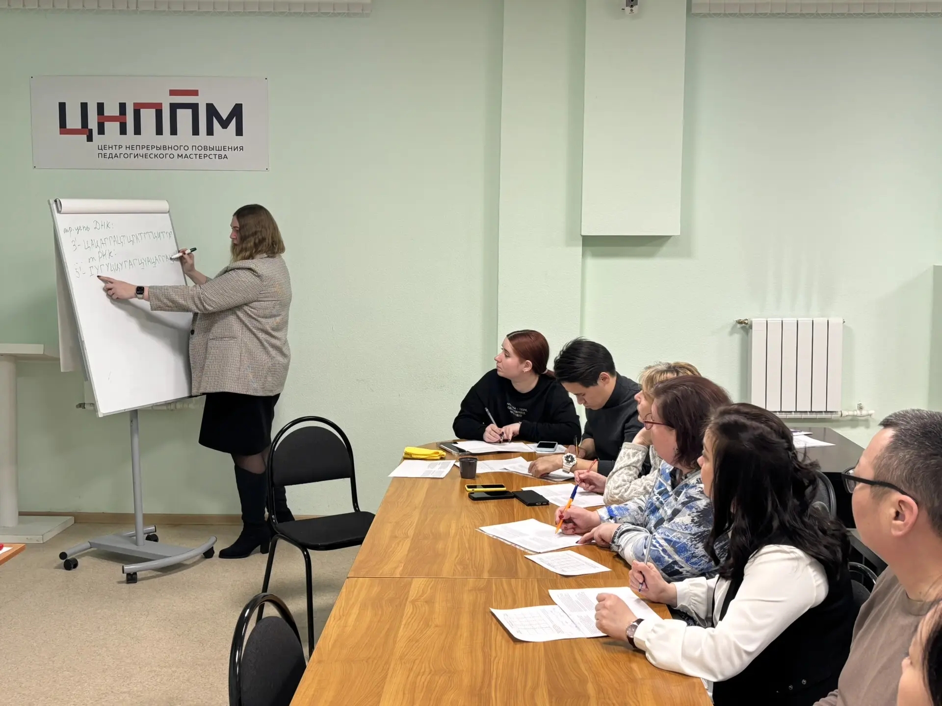 В процессе мастер-класса председатель предметной комиссии ЕГЭ по биологии напомнила педагогам о принципах матричного синтеза и о правилах, которые необходимо помнить для решения задач на биосинтез белка.